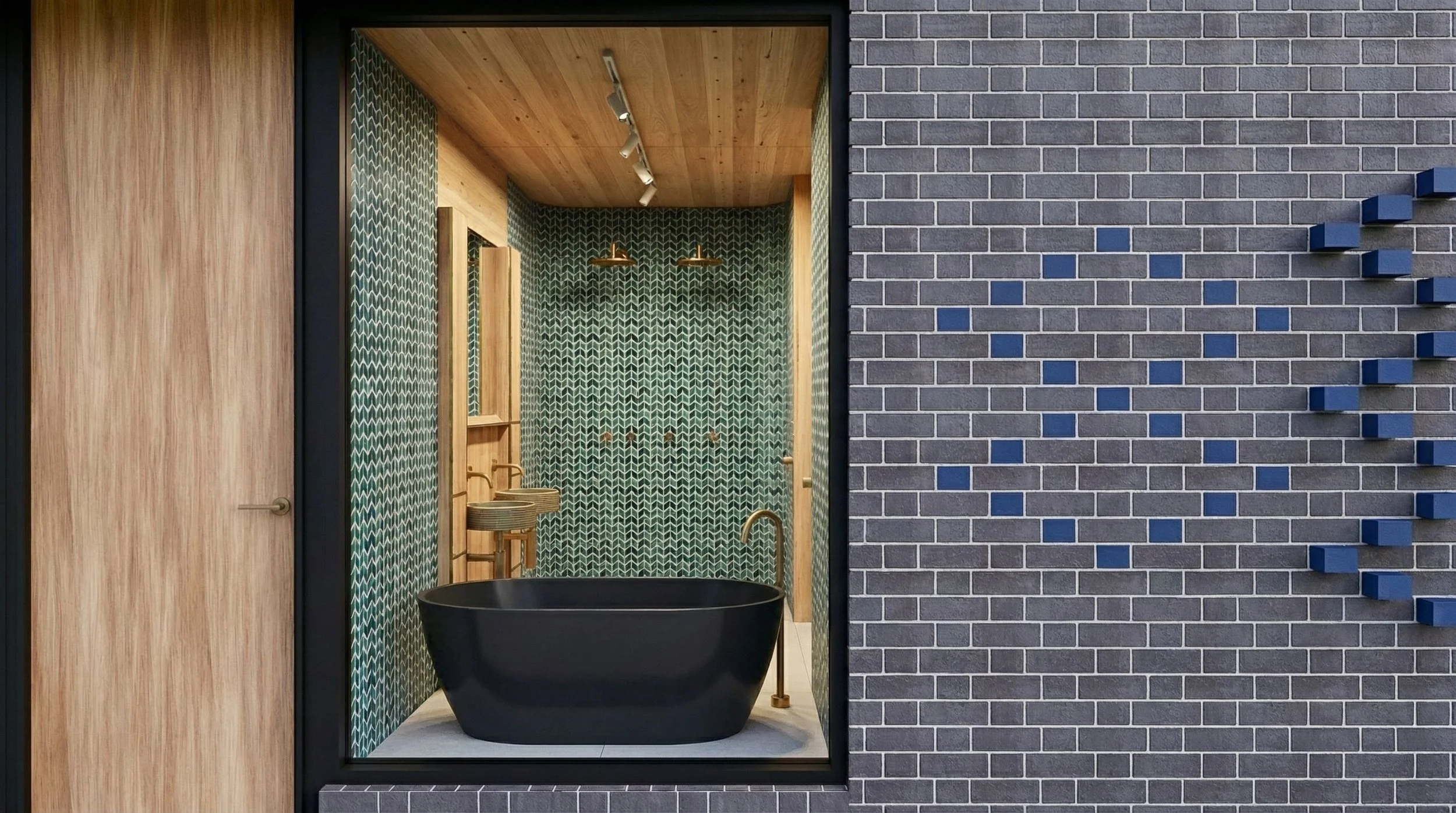 Master bath/ensuite. Appointed with Italian glazed tile and brass fixtures.