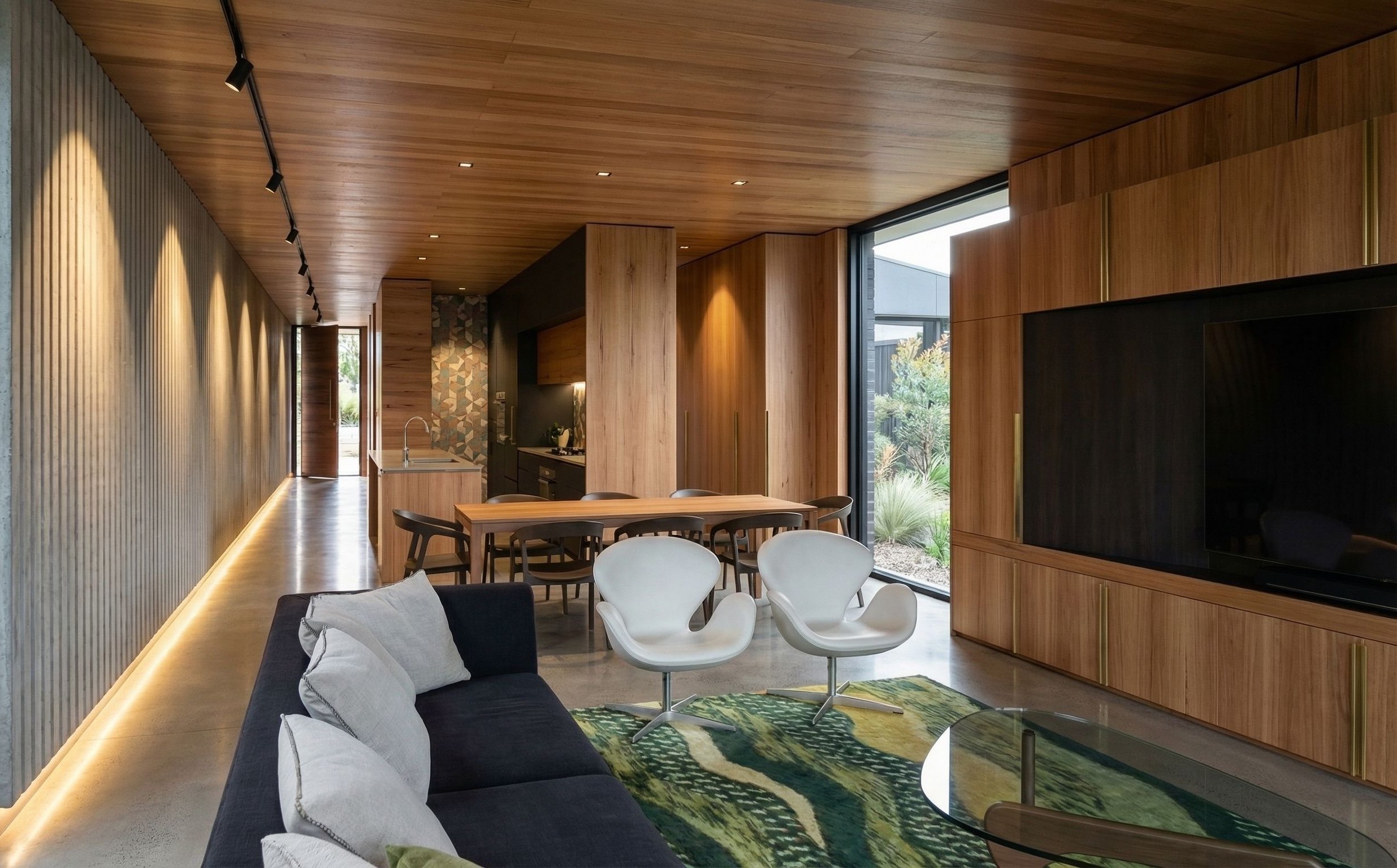 Open concept living with designer kitchen.