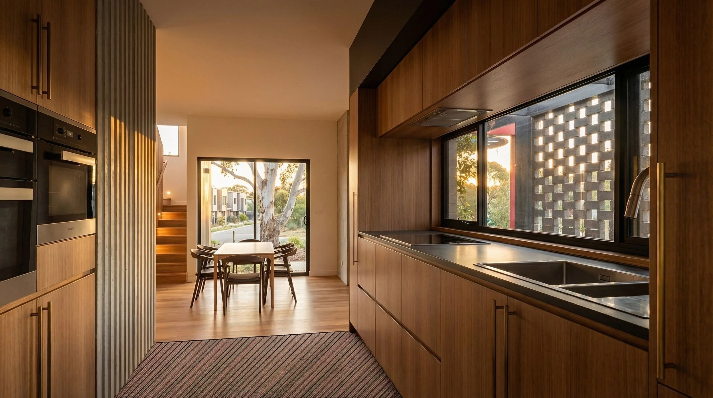 Kitchen Option B - All joinery is finished in Blackbutt timber with aged brass handles. Appliances are Miele including induction cooktop and steam oven. A cast concrete feature wall brings an industrial vibe to the area with optional vinyl flooring.