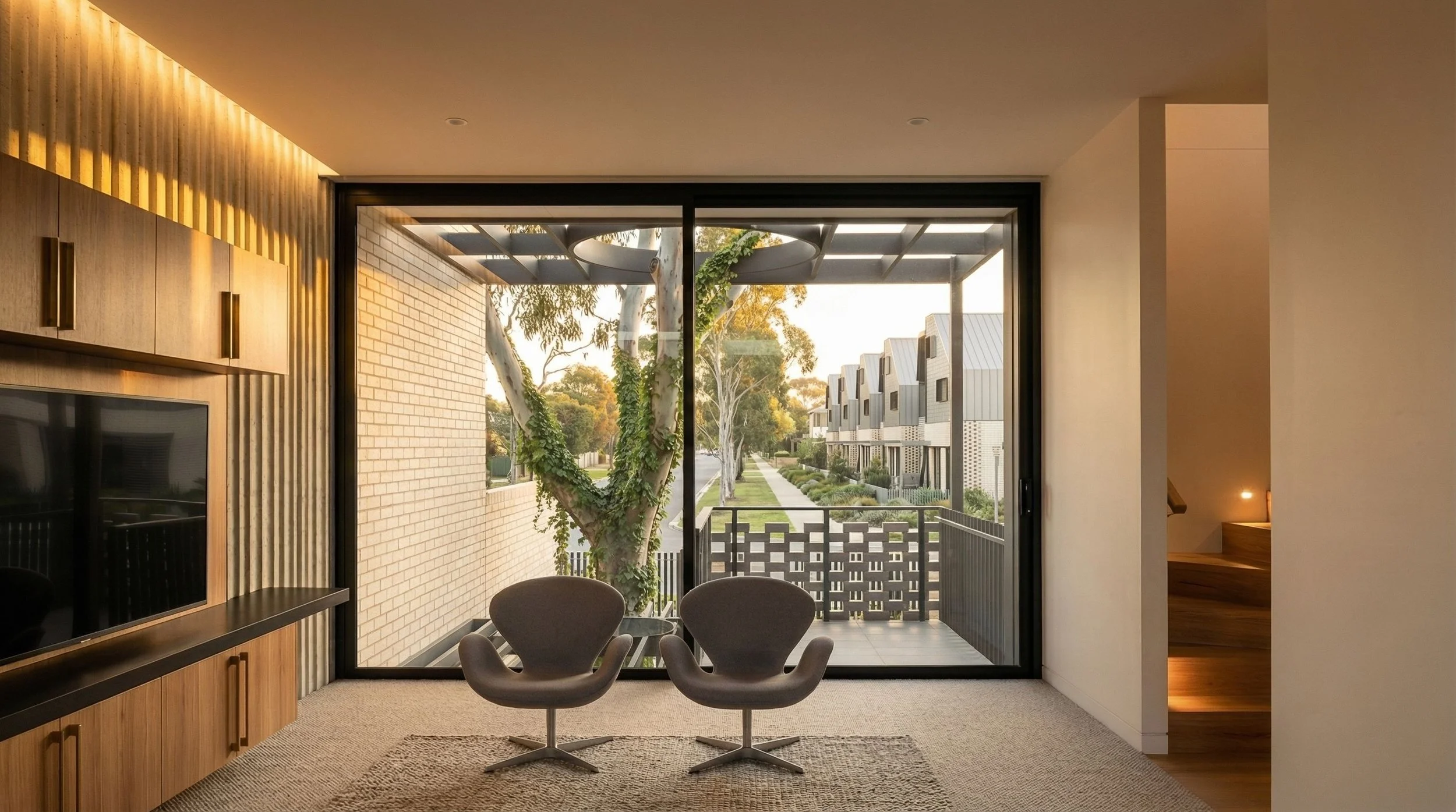 Generous living room with outlook to neighbourhood with pergola over outdoor entertainment space below.